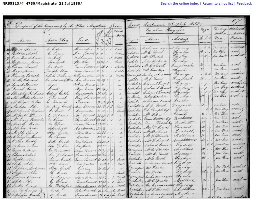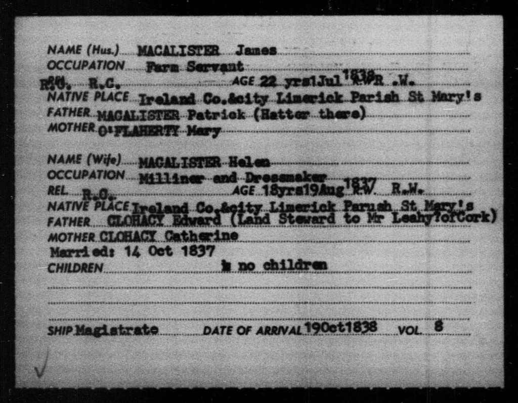 According to the site ‘Ships to Australia’ they boarded the ship ‘Magistrate’ on the 8th March 1838 in Cork. Shipping records show, James MacAllister from Limerick, was a 22-year-old, farm servant married to an 18-year-old. They could both read and write. (I do not think so.) He was a Catholic and was engaged by a Mr Robert Beatson of Sydney who agreed to pay him £25 per year with rations. The ship’s records also show the occupations of the married men, single men and single women. Married women were not acknowledged other than their age.