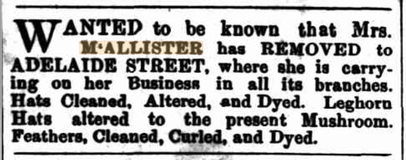 Some of the records are a little confusing as Queensland did not separate from NSW until 1859. I believe the family were in Sydney for eight years before moving to Queensland. They moved to Brisbane where Mrs McAllister was a Hatter. She took out an ad on Tuesday 22 December 1868, a month after the death of her husband, in the Wide Bay and Burnett Advertiser (p3). This is a bit curious as Adelaide Street is the main shopping area in Brisbane and it seems odd that the ad was place in a newspaper many hours north of Brisbane city. They must have had other relatives living in that area as that is where Ellen McAllister died in 1898.