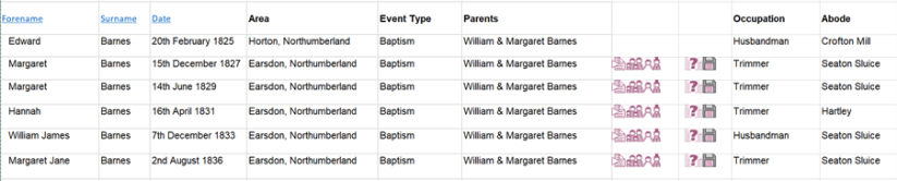 Hannah was born in 1831 in Hartley, north of Tynemouth. Her father was a farmer, a husbandman. The following is a table of the family of William and Margaret Barnes and their children’s baptism dates.