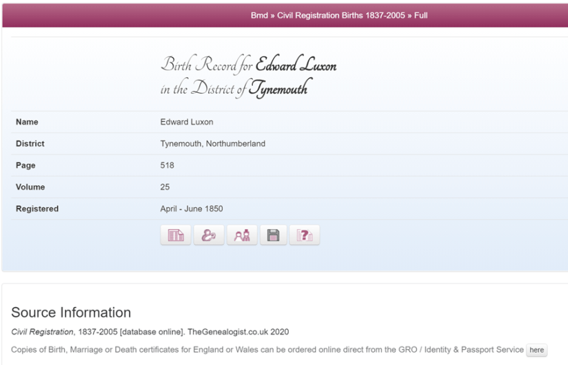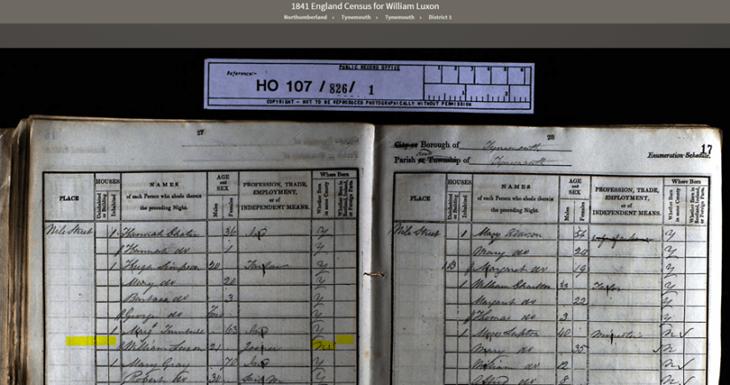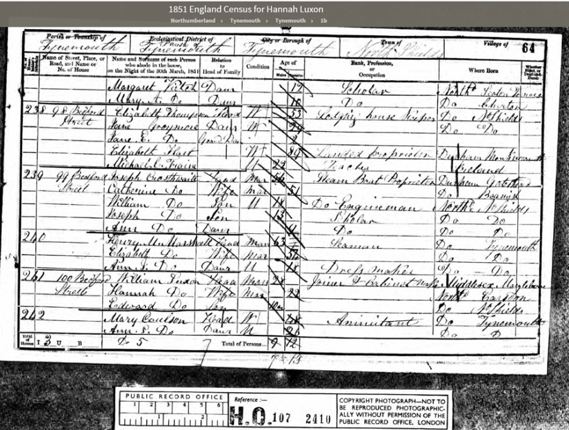 William Luxon and Hannah Barnes were married in Tynemouth, Northumberland, England in 1849. I think William was born in Middlesex and probably moved north for work. Tynemouth was a large shipping port. According to the 1841 England Census, there was a William Luxon, a joiner, living in Tynemouth. Here he states his age at 21 – an adult. If that was correct the birth certificate above putting him born 1819 could be the right one.