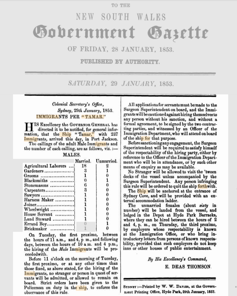 The ship, Tamar, arrived in NSW and the following is the information for those whose intention it was to hire. Note- he was the only ‘joiner’.