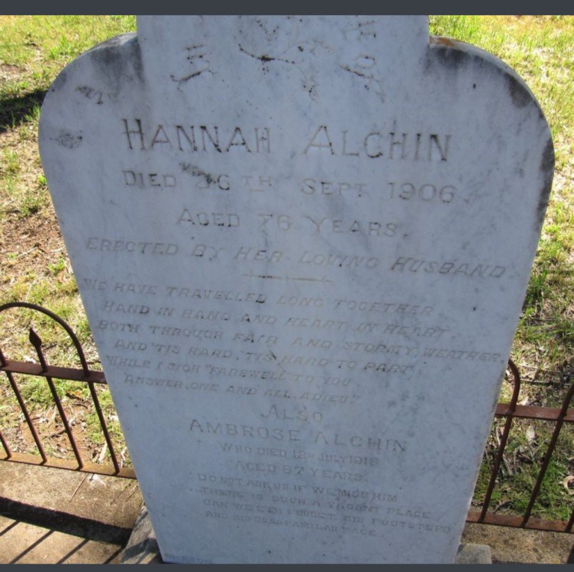 In 1868 a very strange newspaper report appeared in the Sydney Empire newspaper describing an incident at the Alchin home where Hannah had been left in charge of the children. The accusation was of burgulary but the case was dismissed. Although I cannot find evidence of a marriage it seems that Ambrose and Hannah had two children together- Eva born 1870 and Sydney born 1874. She died in 1906 and her husband errected a headstone over her grave at Stockinbingal NSW