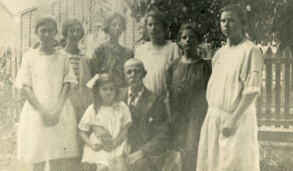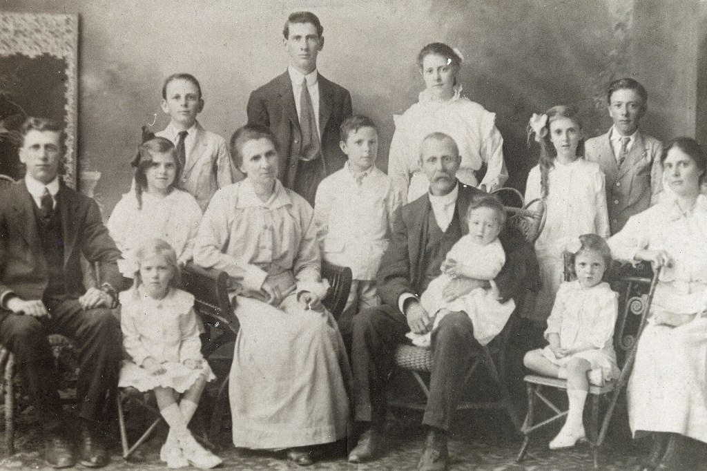 This is my guess. I think the photo was taken in 1916 and if so – Standing back row left to right: Alex 13, Albert 20, Mary 16, Maud 12 and John (Jack) 15. Centre Row left to right: James 21, Elizabeth 8, Helen 39, Reg 10, Albert 48 and Helen 19. Front row: Alice 6, Vince 1 in his father’s arms and Veronica 4. I don’t think Hilda is in this photo, as she was born in October of 1917. James died in WW1 in the September of the following year, 1917.