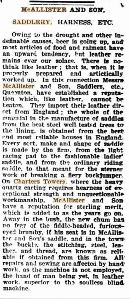 When Albert’s father, James, married Mary Gallagher, in Brisbane, 1865, he described himself as a saddler. Albert, Ernie and James Jr all learnt the trade and established themselves in business and set up a shop in the main street of Charters Towers and called themselves McAllister and Sons Saddlery, Harnesses etc.