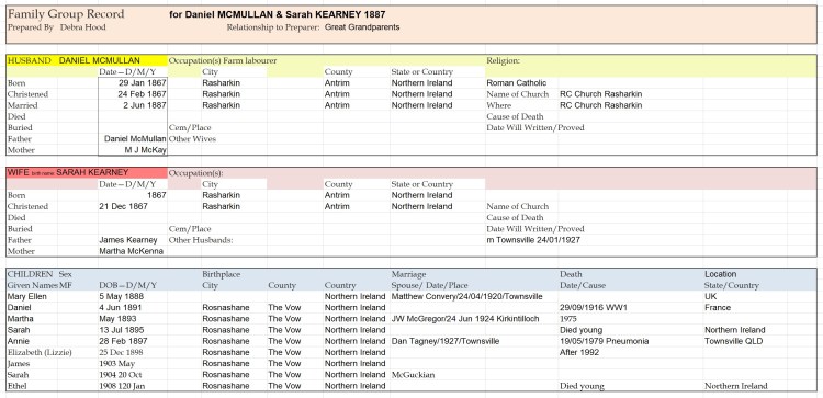 | G Grandparent | Dan & Sarah McMullan | 1887 |