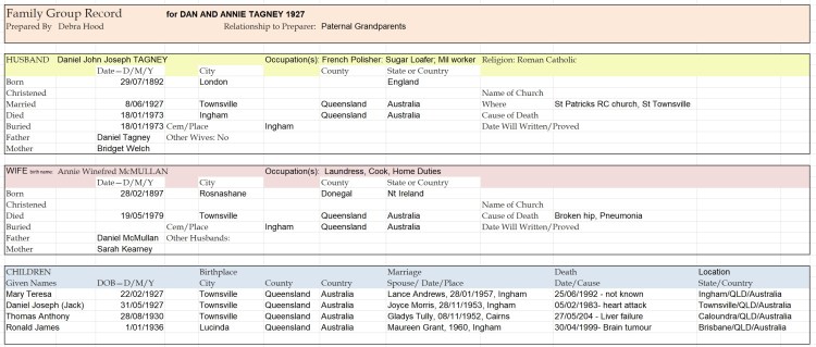 And one more generation back…and a very important explanation. The following very sketchy Family Group Record shows Mary and Jane Connelly who were sisters. Mary is Dan’s Grandmother and Jane his Great Aunt. It was Jane who sponsored Grandad to come to Australia in 1914. I imagine that his grandmother took great interest in her grandson’s prospects and encouraged her sister to support Dan. He arrived in Townsville and lived with Jane and her family in North Ward for a number of years.