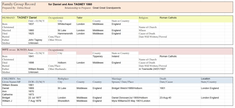 | G Grandparent | Dan & Bridget Tagney | 1889 |