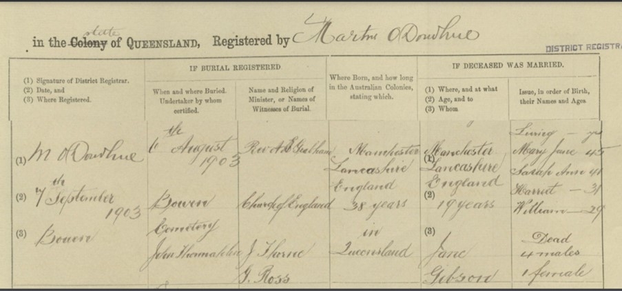 The registrar was O’Dowhue. William was buried on the 6th August 1903 at the Bowen Cemetery with the rites of the Church of England. He was born in Manchester, Lancashire, England and lived in Queensland for 38 years. He was married to Jane Gibson, in Manchester, Lancashire, England when he was 19 years old. They had 9 children. Living- Mary Jane 45, Sarah Ann 41, Harriet 31, William 29 with 4 males and 1 female deceased.