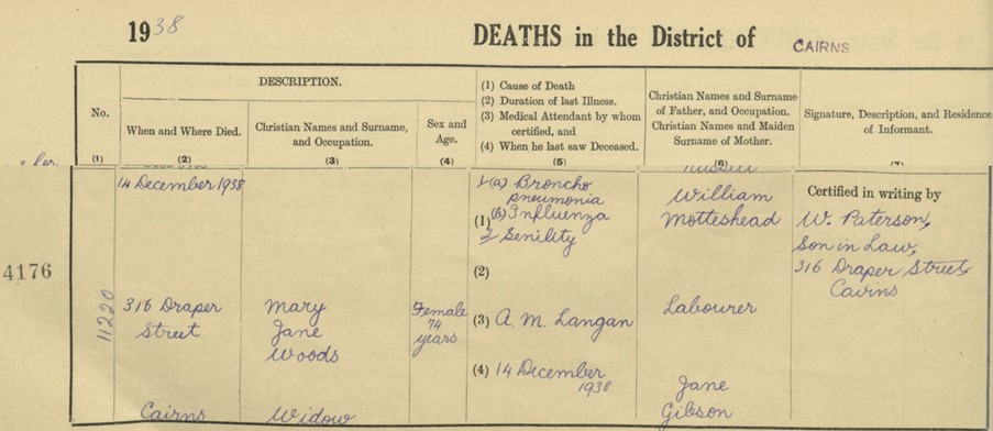 On 14 December 1938 Mary Jane Woods, a widow, of 318 Draper Street Cairns aged 74 years died of Bronchopneumonia, Influenza and Senility. She was attended by A.M. Langan and was seen the day of her death. Her father was William Motteshead a labourer. Her mother was Jane formerly Gibson. The certificate and description given by W. Paterson the Son-in-law of 316 Draper Street Cairns.