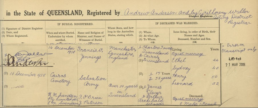 Mary Jane’s death was registered in Cairns on 16 December 1938. She was buried on the 14th December 1938 (the day she died) at the Cairns Cemetery by H.S. Svendsen Pty. Ltd. Per E.M. Svendsen. The minister from the Salvation Army was Francis V. Jennings and the witnesses were F. O’Brien and J. Paterson. Mary Jane was born in Manchester, Lancashire, England and spent over 50 years in Queensland. She was married in Charters Towers and then in Cairns. Her first marriage to James Glover was for 17 years and the second to Arthur Archibald Woods for 58 years. Surviving children were from her first marriage – Ethel 33, Sydney 40, Henry 50 and Leonard 52. From that marriage 8 males and 1 female are deceased.