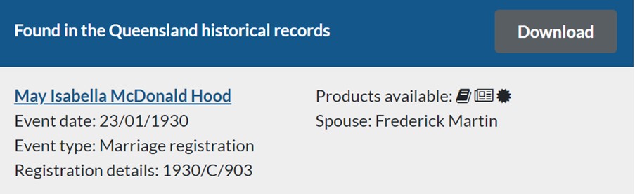 With a name incorporating Isabella McDonald it is most likely this is the granddaughter of Isabella McDonald Maund and first cousin to Laurie Hood – John’s father. May married Frederick Martin in Townsville. They had two children – Crystal and Joyce but I can’t find certificates although Ancestry info says Joyce was born in Townsville 8th February 1930.