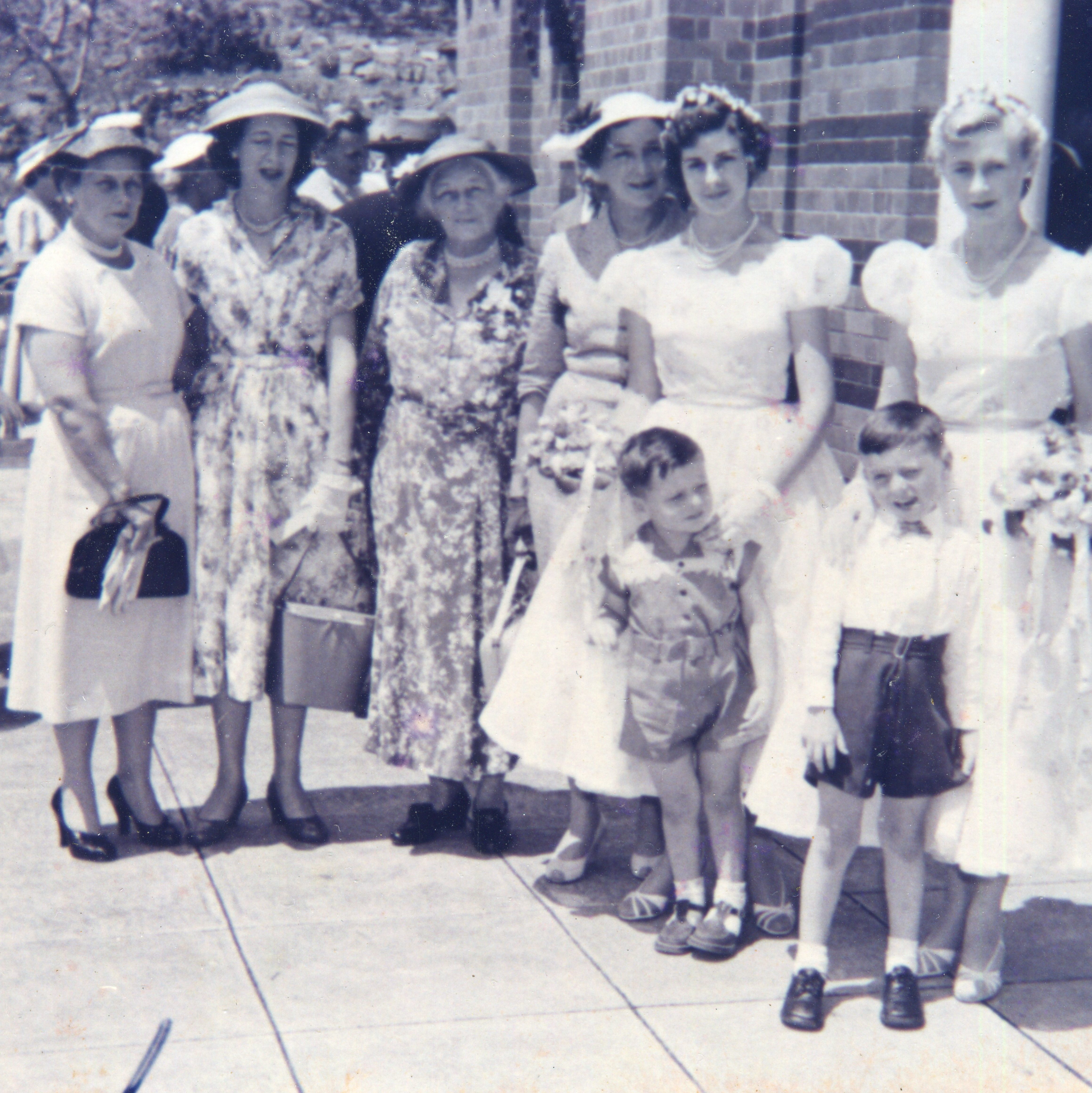 Parents grandparents cousins aunts as well as nephews are all welcome. Below is a photo at Vonnie’s wedding- left to right: Julia Cowie, Joy, Nanna Hunter, Ann McAllister, Rae with young Peter and Merle with John.