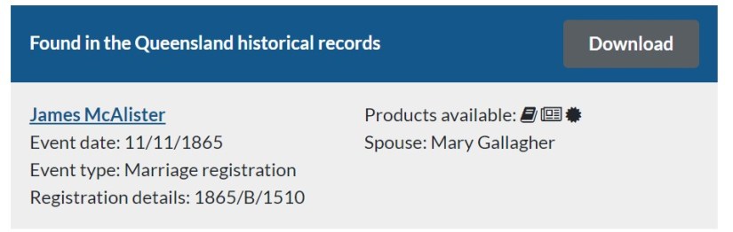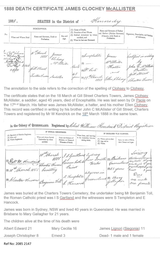 James McAlister, a saddler from Brusnwick Street, Fortitude Valley, Brisbane married Mary Gallagher, from Spring Hill. They married at St Stephen’s Church, Brisbane. She was born in Co. Clare, Ireland 1843. Her father John, was described as a ‘Government Officer’ and her mother was Margaret Egan. The witnesses were Thomas Connor and Anne Gallagher. The officiating priest was Robert Dunne. (This marriage certificate is in the possession of Mrs George Miller, formerly Meryl McAllister of 8 Milne Lane, West Mackay, 4740.)