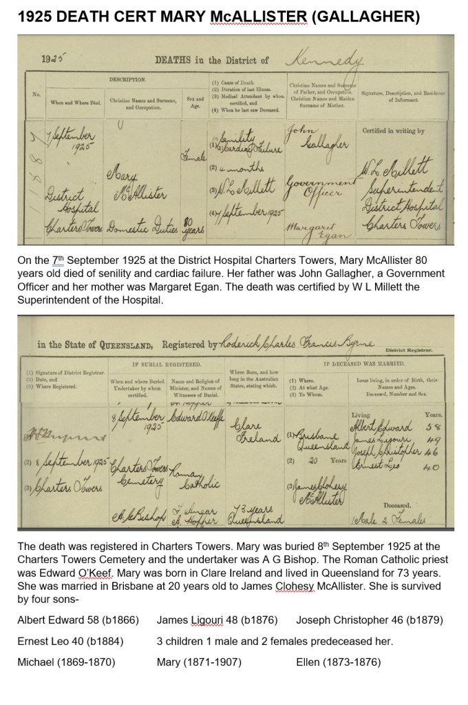 Mary and her children continued to make their lives in Charters Towers. She died aged 80 at the Charters Towers Hospital.