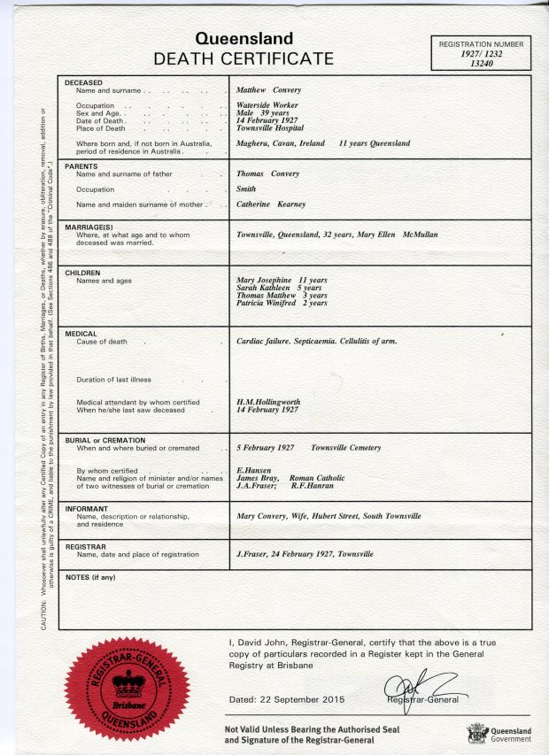 I believe Annie lived in Hubert Street South Townsville with Mary Ellen and Matthew for a while but as their family grew she found work and her own accommodation. 1927 and the world for the sisters was about to change. Somehow Matthew sustained an injury. Grandma said that he was injured at work, but I don’t know for sure. He developed cellulitis of the arm, followed by septicaemia and finally on the 14th of February Cardiac failure took his life. By this stage Mary Ellen had four children to support. She decided to return to Ireland.
