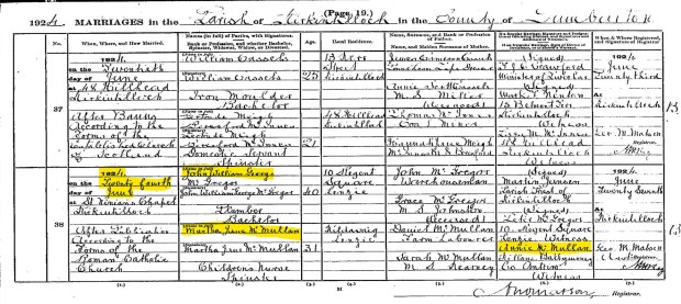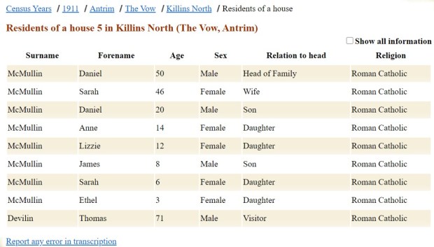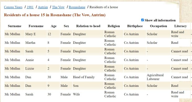 In the 1901 Census she was twelve and living with her parents Daniel 38, Sarah 30, Dan 9 and sisters Martha 8, Sarah 5, Annie 4 and Lizzie 4. They lived at house 15 The Vow, Rosnashane in the county of Antrim. Daniel was listed as an agricultural labourer. There was another family living at house 10 with another Daniel McMullan 60 and his four children Maryanne 19, Catherine 17, James 15 and Maggie 13. I wonder if this family was related. A cousin maybe?