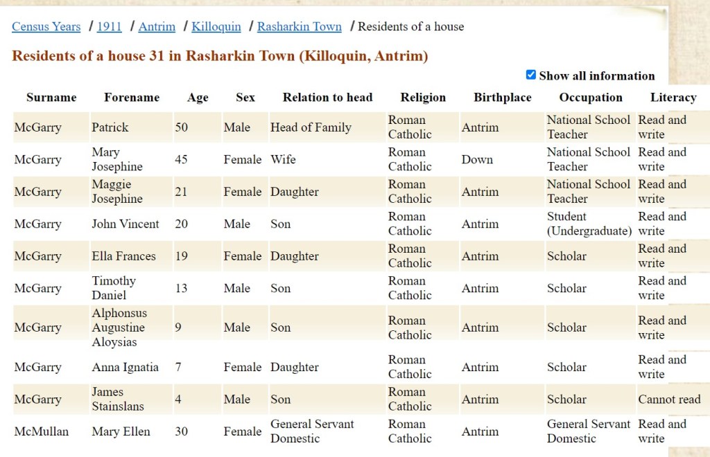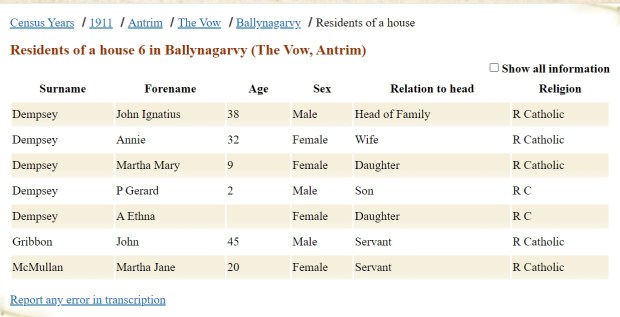 Mary Ellen worked for Patrick McGarry and his family. Patrick, 50 his wife Mary Josephine 45 and their eldest daughter Maggie Josephine 21 were all listed as National School Teachers. John 20 an undergraduate, Ella, Timothy 13, Alphonsus 9, Anna 7 and James 4 completed the family. Mary Ellen would have been busy! She is listed on the Census form as being 30 years old, but the head of the house Patrick McGarry signed the form and my have just guessed. The family was living in house 31 in Rasharkin which is where Mary Ellen’s mother was born. There was a school and a hall close by. I believe this family really impressed Mary Ellen. She named her first daughter Mary Josephine and her son Patrick.