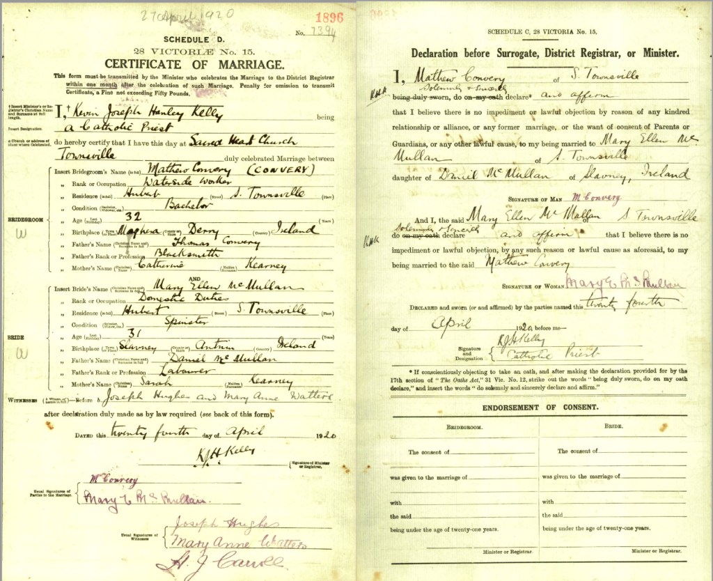 Mary Ellen McMullan departed London aboard the Orontes in February 1920 and arrived in Brisbane in March made her way to Townsville and in April married Matthew Convery. Matthew had arrived in early 1916 aboard the ship, Roscommon and according to the Electoral roll worked as a waterside worker. Their marriage certificate registered the names of Mary Ellen’s parents as Daniel McMullan and Sarah Kearney, that, along with information from the shipping records and the Census data of 1901, confirms that she was most Annie’s sister. Further evidence was to follow.
