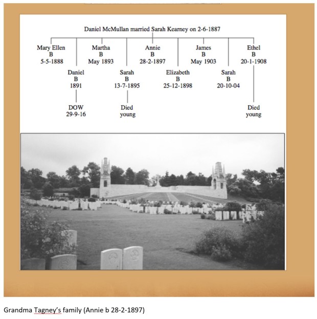 These ten years were tumultuous both in the life of Ireland and in Annie’s life too. Her father died some time in this ten year period, her brother went to war and died in 1916 and her sister, Mary Ellen, left her baby girl with the family and went to Australia. Annie developed a close and loving relationship with her niece, Mary Josephine and often spoke of her.