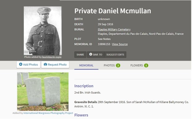Daniel was the elder son of Daniel and Sarah McMullan, of Killans, about five miles south of Ballmoney. There were two boys and seven girls in the family. Unfortunately, two of the girls, Sara and Ethel, died young, both of them having contracted Scarletina otherwise known as Scarlet Fever. Daniel, as a young boy, attended St. Columba’s school at the Killans and later when he had left school, he worked as a farm labourer wherever work could be had. He enlisted in Belfast into the Irish Guards and was eventually placed in the newly formed 2nd battalion.