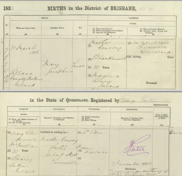 On further investigation and the purchasing of the Birth Certificate of Mary Josephine it was revealed that Mary Ellen and Matthew travelled to Brisbane in 1922 to register the birth of their daughter born on 31 March 1916 in Killans, County Antrim, Northern Ireland.