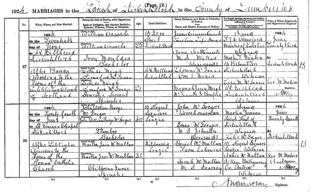 In 1924 she was in Scotland and married John McGregor, a plumber. He was forty and she was thirty-one. They lived in Lenzie which is half way between Glasgow and Kirkintiloch. Annie, my grandmother was bridesmaid at the wedding.