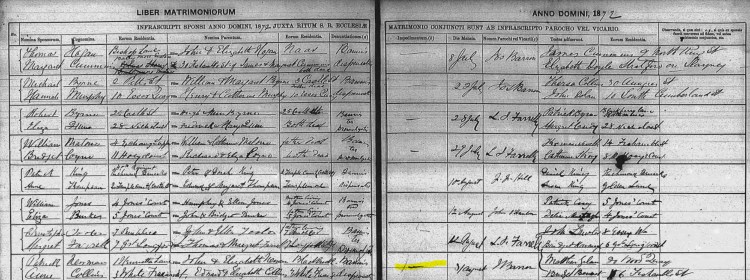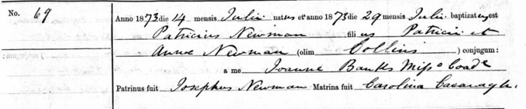 Patrick Newman and Anne Collins were married 31st August 1872 in Dublin. They were Roman Catholics.