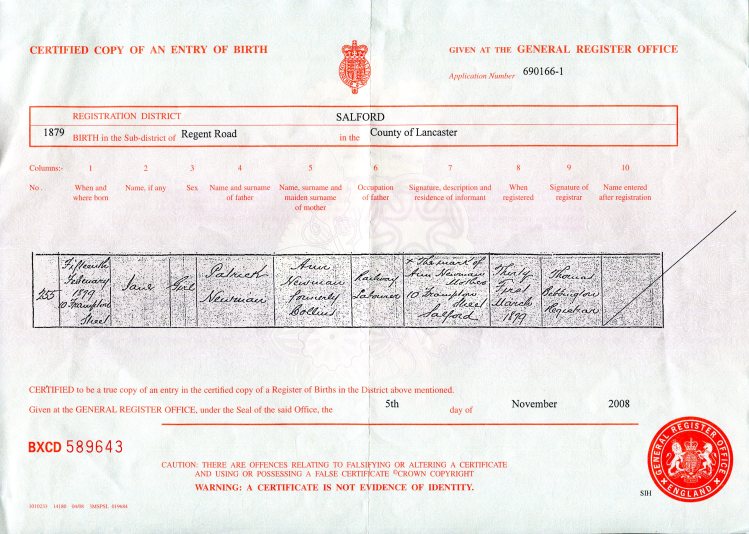 It seems very odd but there seems to be a John Patrick Newman and a John Henry Newman who were brothers. Very confusing. I think the former was Patrick, the first born. He would have been born 1874 and died at the age of 81 whereas, John Henry was born 1884 probably in London or just before the family departed for Australia. He had a twin sister Anne as described in the sipping lists. He died in 1947 and he would have been 63.