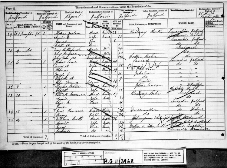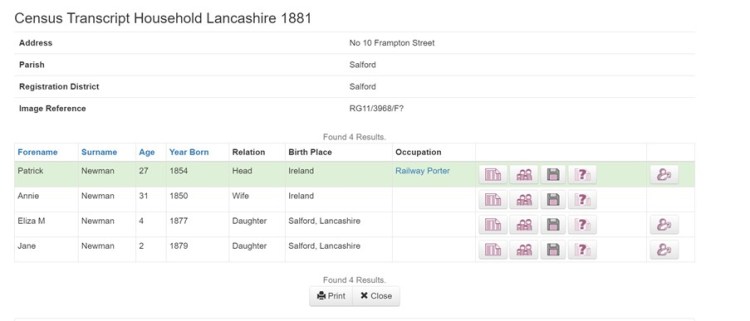 In 1881 the family was living in Salford. Pat was working as a railway porter, supporting his wife Annie and two daughters, Eliza M 4 and Jane 2. Their son, Pat, does not appear on the Census. He may have been with other relatives.