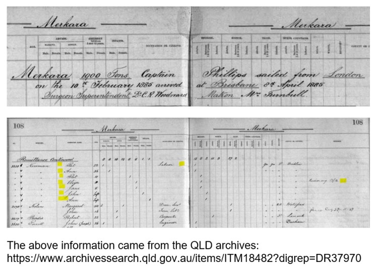 This suggests that they had family or friends living in Queensland who invited them to join them. I may have found that family. They sailed from London on 10 February and arrived in Brisbane 8 April 1885. They travelled aboard the R.M.S Merkara.
