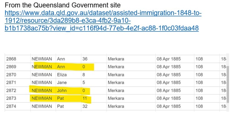 I have also discovered a James Newman who came to Queensland on the Legion of Honor in February 1866. He was 25 years old at the time. This meant he was born 1841 and considering Pat was born 1843 it is quite possible that James was his brother. It is a lead I need to explore. This also gives James time to establish himself as a farmer and encourage his brother, Pat, to come to Australia to join him. James arrived in 1866 and Pat in 1885- 19 years later.