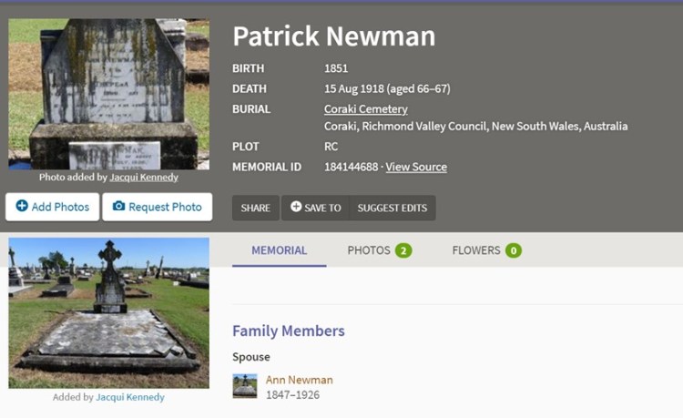 The obituaries of Pat’s children, John Henry Newman and John Patick Newman, mention Carboolture and the Newman family there. James Newman, an Irishman and his wife Elizabeth, formerly Irwin, were initialy residence of Caboolture. They were the parents of James Malcolm Newman who was born 1880 and became a very successful mining entrepreneur. His biography can be found at this site https://adb.anu.edu.au/biography/newman-james-malcolm-11228.