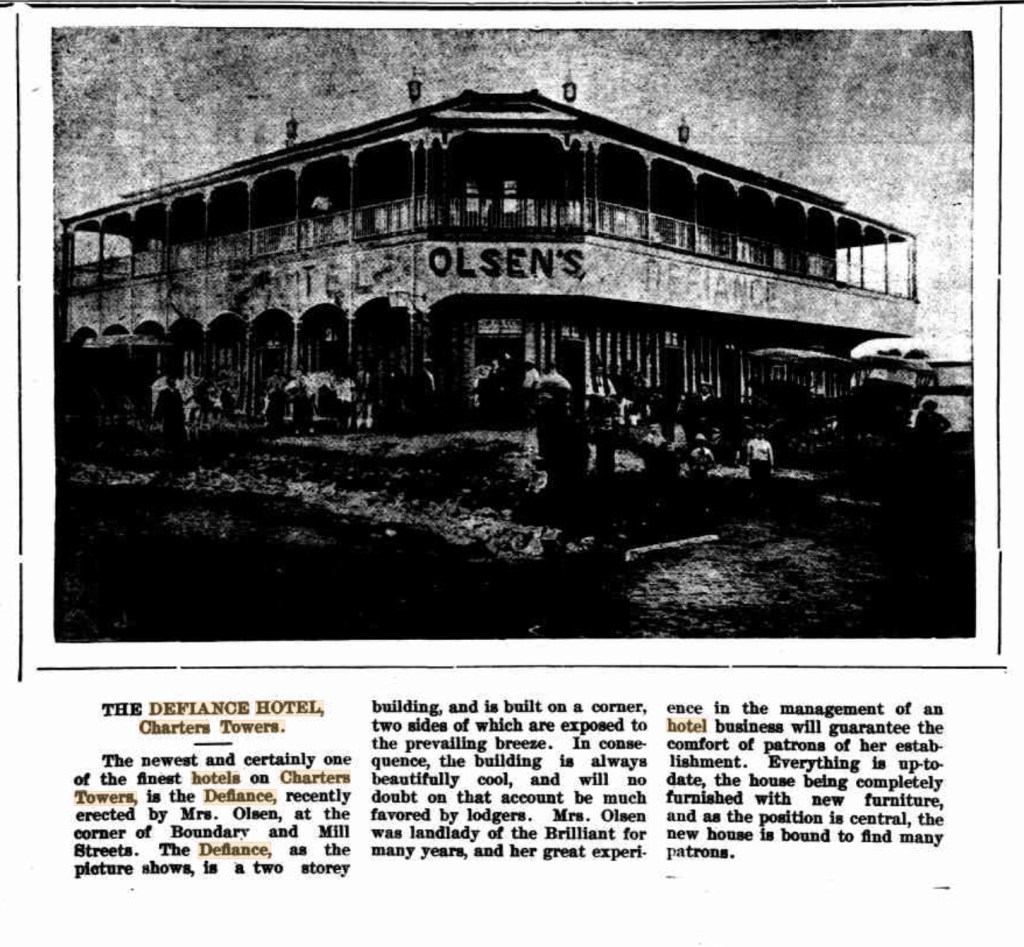By 1895 Ole and Anna Marie had purchased the Millchester Hotel in Millchester, a suburb of Charters Towers. While there were well over 60 hotels for the miners to choose from the name Olsen seems to be synonomous with hotels in Charters Towers in the 1890s. There was an Andy Olsen and his wife who owned the Brilliant Hotel and in December 1896 Olsen’s Defiance Hotel was opened with acolades from the press. I am not sure if our family were also associated with these operations. (Ole had a brother Anund, ten years his junior. I wonder if he was Andy Olsen?)