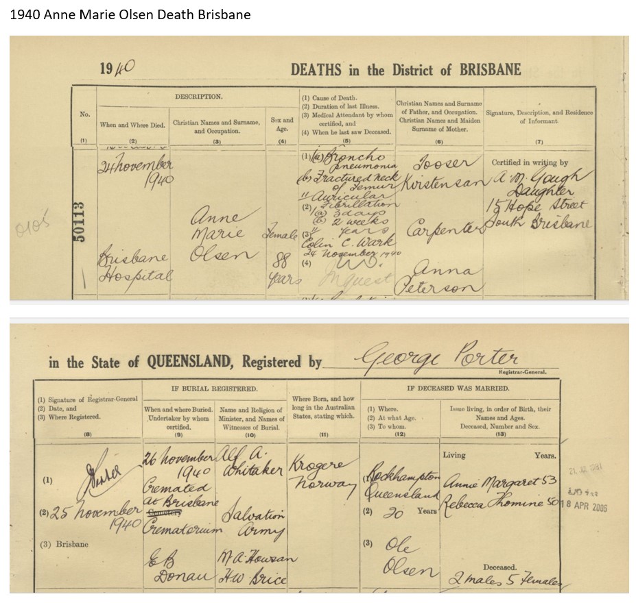 - Anna Florina Olsen died as a small child in 1876 in Queensland.