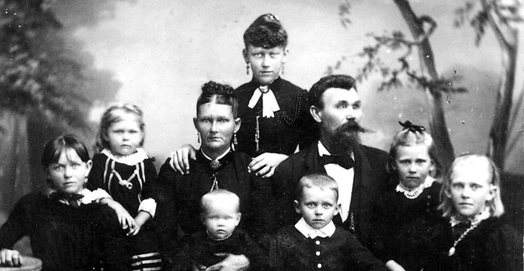 I think these are the people in the photo. Assuming the photo was taken in 1893- Standing centre, Olette (16), Seated L to R Sophie (12), Rebecca (4) Anna Marie (41), holding Thor Jens (2), Ole (41) holding Ole (7), Annie (9) and Elevine Tina (14). Elsa is not pictured as she married in 1890. .