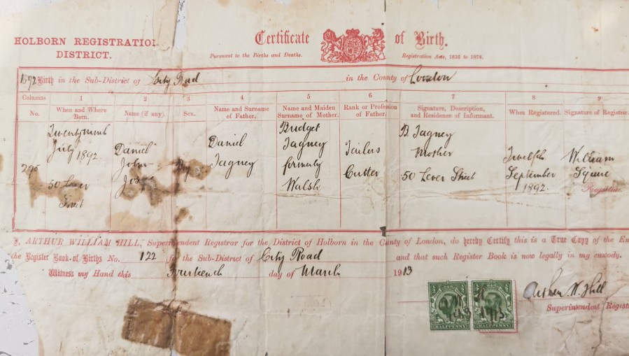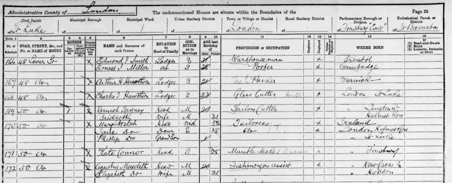 According to the Census of 1891 Daniel and Bridget were living at 50 Lever Street St Luke, Finsbury East where Grandad was born the following year. He was 24 and she was 21. At the same time there were six other people living at this address among them, Mary Welch 52, a tailor’s cutter and her daughter Jane 18 also a tailor’s cutter along with Jane’s son, Phillip Welch who was just one. Mary Welch was Bridget’s mother. By deduction I assume Bridget also had these skills and would have been able to support herself and her family.