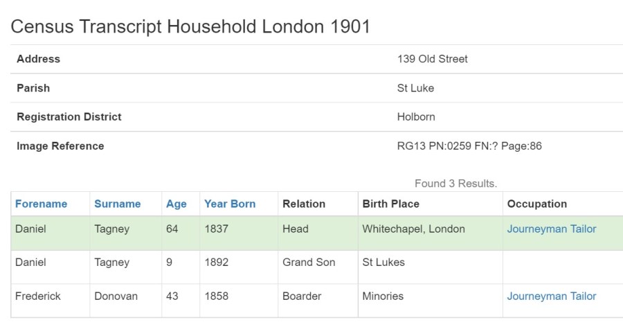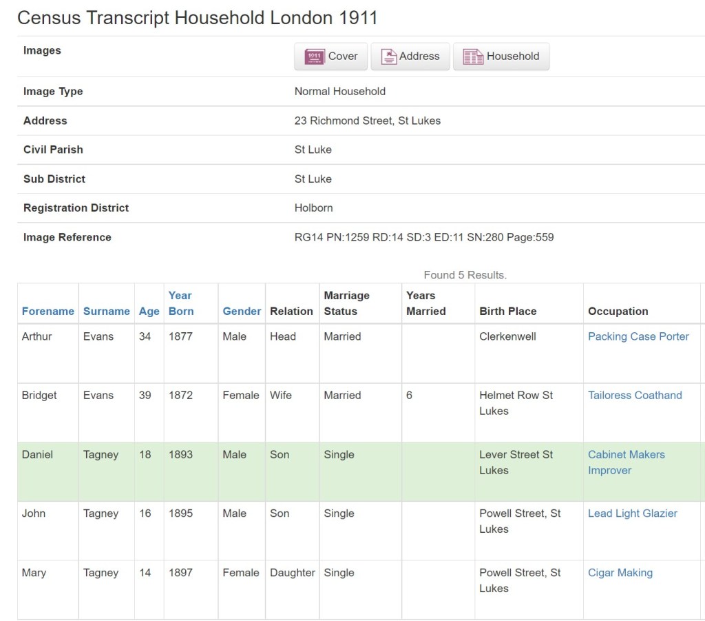 To have any insight into Dan’s story we have to look at his family circumstances. The first time he appears in the Census is 1901. He is nine years old living with his sixty-four year old paternal grandfather at 139 Old Street. There were six people living at this address. His grandfather was a journeyman tailor which meant he was qualified. I believe he was staying with his grandfather while his mother, Bridget, was organising a funeral for his father, Daniel. I think Bridget would have had John who was seven and Mary five with her. Her mother Mary Welch also lived in St Luke and may have had the children I cannot find Bridget Tagney on the 1901 Census. I did find a record for the death of a Daniel Tagney that occurred around the time of the Census. I do not know the circumstances surrounding Daniel’s death but in 1901 the family would have been if a fairly desperate situation.