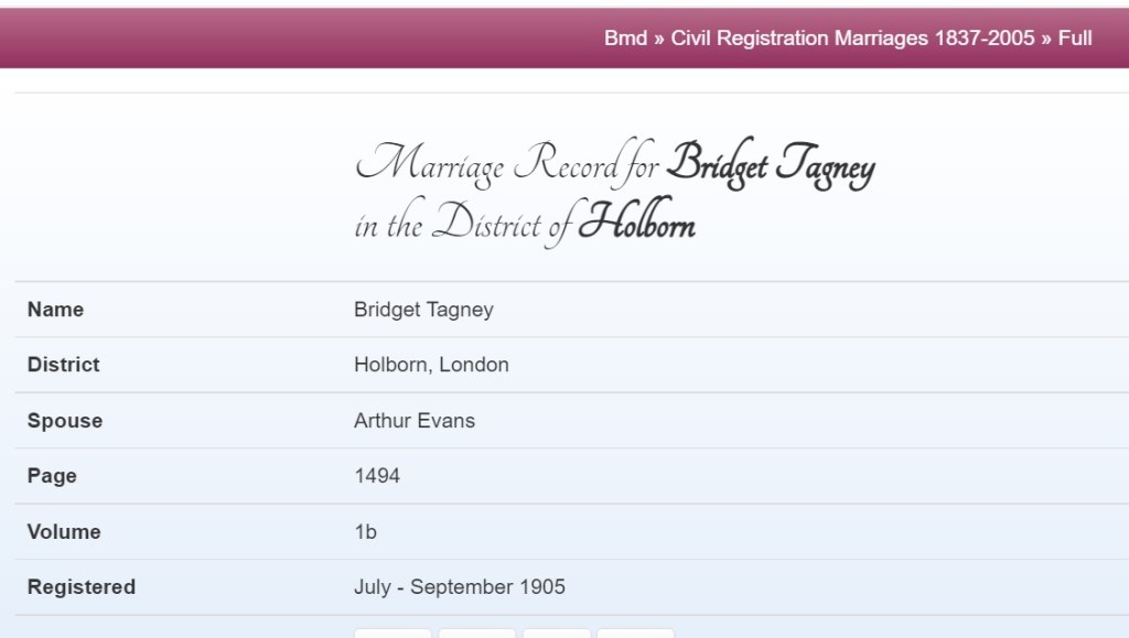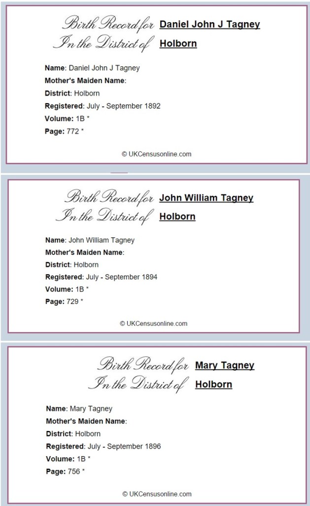 He married Alice E Bush in 1921 (Vol 1B p.1469) and had three sons- John F Tagney b 1922, Daniel Charles Tagney b 2/1/1923 (Vol 1c p55) and William P Tagney b1937. William P married M Eastbury in Shoreditch in 1963.
