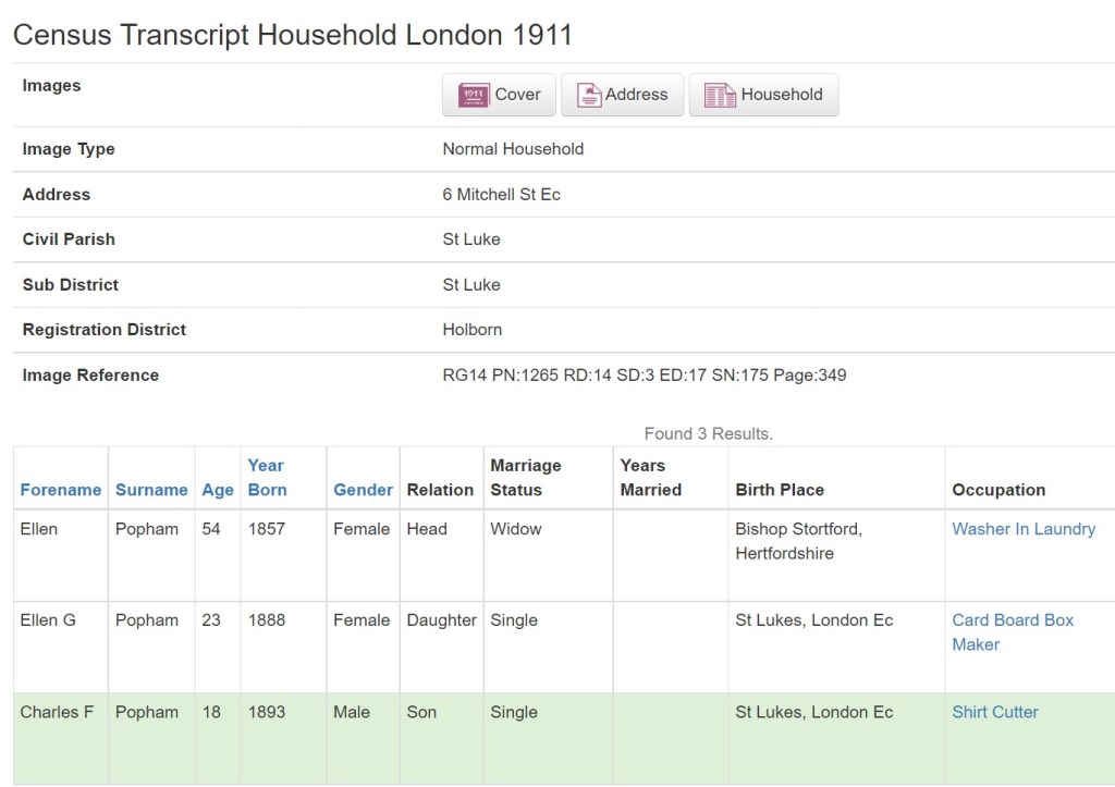 Amongst Grandad’s possessions was a photo which I eventually worked out was of him and sent to him in Australia from a friend, Charles Popham. On the 1911 Census, Charles is listed with his mother and sister living at 6 Mitchell Street. He was a shirt cutter and may have met Daniel through his mother, Bridget. They were both 18 and lived close by. London was a very vibrant city.