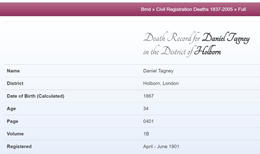 Dan’s grandfather, Daniel Tagney, died at Hammersmith aged 88 (Vol 1a p 322).