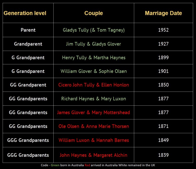 The table below lists the generations of my mother’s family (Gladys Tully). Those listed in green were born here, and those in red migrated to Australia.