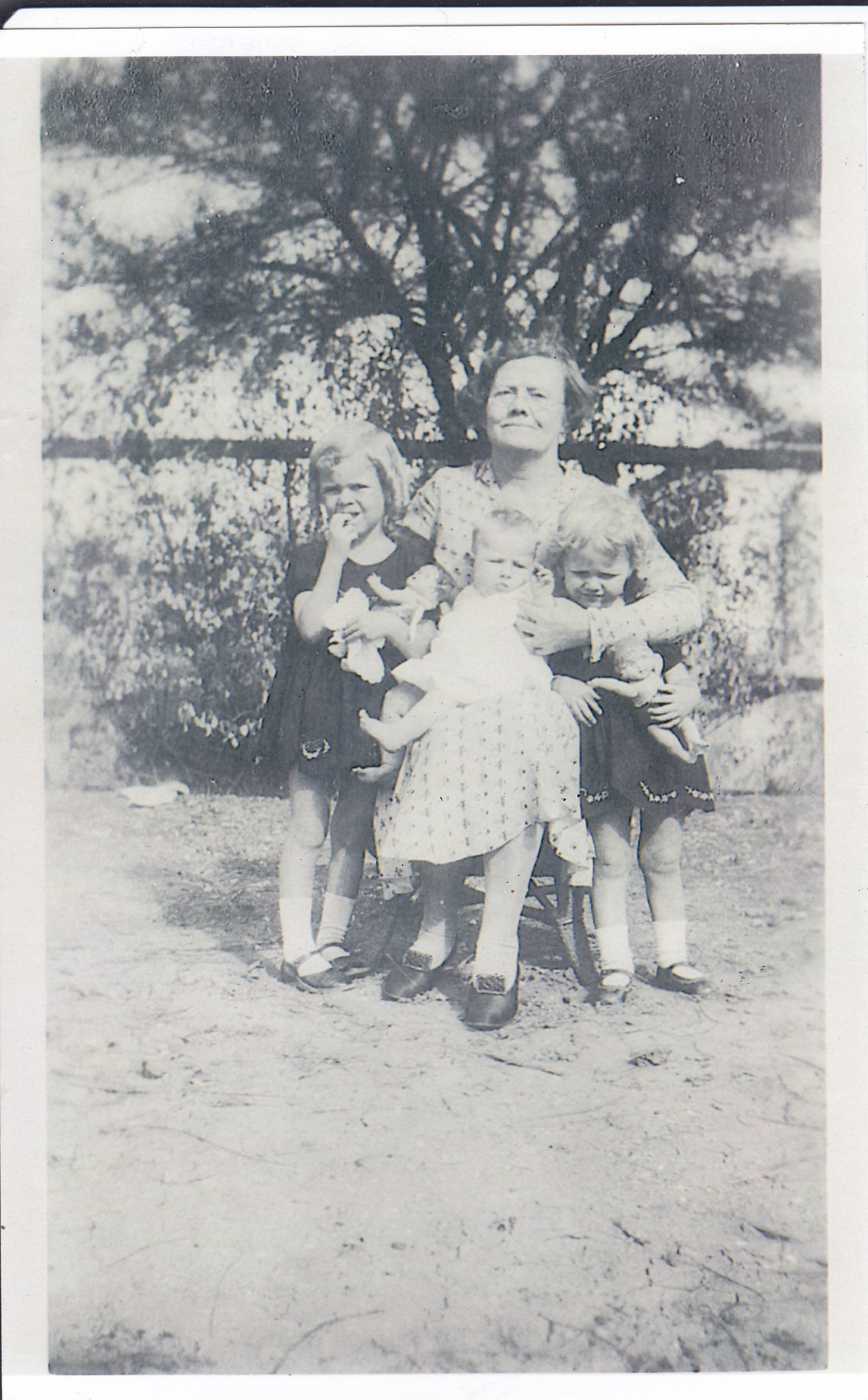 In those days the sheep and cattle were driven down the river bed by the drovers. We used to play in the river bed and make cubby houses by digging holes in the sand under the rubber trees which grew by the hundreds in the river. The drovers had horses with them, and one day when we were playing in the rubber bushes, the horses from the drovers’ herd came galloping along and over our hiding places, crashing about all over the place. However, we lived to tell the tale but I have an idea that mum never knew about most of the things we used to do. About a mile up river from our house there were two Chinamen’s gardens. One was on our side of the river and one on the town side. The three of us[when I say the three of us I always mean Jimmy, Susie and I used to go and steal oranges from their trees. One day Susie ate so many she was pooing crushed oranges. Susie says she was not, she was vomiting them. Never mind, one of us is right. Mum used to give us an old frying pan and a bit of meat and we would go and have a picnic in the river also. I suppose an orange episode happened on that adventure also.