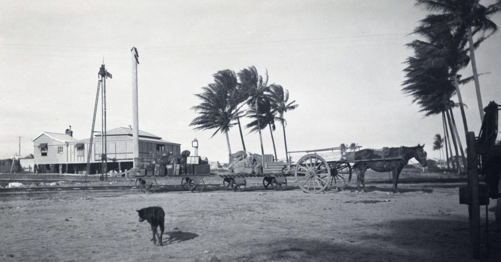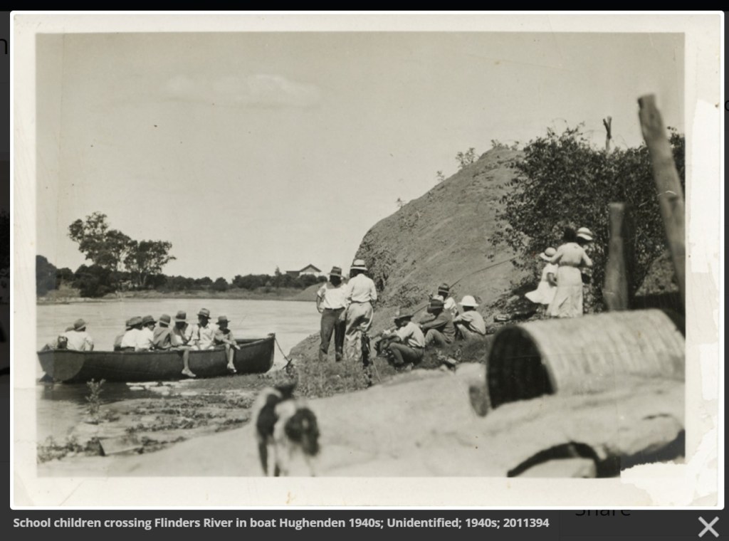 We had so many adventures in Hughenden I don’t know where to start. The river was mostly dry, but when the rains came, and the water came down the river bed, it did not just trickle down, it came in a high wall of water, with trees, sheep and any other detritus which was in the way of the flood. We could hear it coming for miles. Just up from our house there was a bend in the river and a creek called Station creek. The water would come around that bend in a great wall, it was very frightening. Sometimes Jimmy, Susie and I used to play across the river on the high bank, which was on the town side of the river. The bank of the river on that side was eroded away in places, leaving a sort of gully or gullies running down from the top to the bed of the river. We used to get hessian bags and slide down the gullies. One day we were doing this and heard the river coming down. Like all children, we had to have one last slide-down before we raced home across the dry bed of the river. That day we just made it. I think we shook with fright for a week. If you have ever visited Hughenden, you will know that the Flinders River is quite wide there.